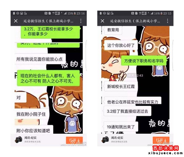 近日,一則題為《延安微信招生(3.2萬保上新城小學(xué))請(qǐng)相關(guān)部門給予調(diào)查公布真相》的帖子在朋友圈瘋傳,內(nèi)容是一位微信名叫“延安微信招生(保上新城小學(xué))”的微友,聲稱只要花3.2萬元,保證可以在新區(qū)小學(xué)入學(xué),并解釋有中間人,錢并不是直接給校長王紅霞,但愿意提供自己的車號(hào)、身份證號(hào)、家庭住址等信息作為擔(dān)保。3.2萬真的能夠保上延安新區(qū)小學(xué)嗎?事情真相究竟如何,記者展開調(diào)查。