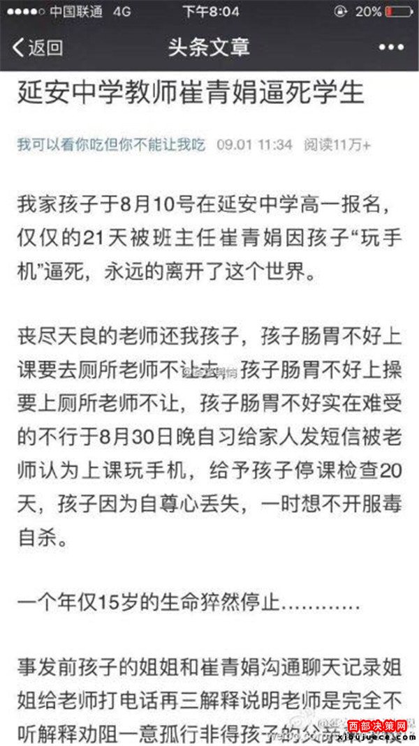 西部決策網(wǎng)訊 近日,據(jù)微博我可以看你吃但你不能讓我吃,爆料,我家孩子于8月10號(hào)在延安中學(xué)高一報(bào)名,21天被班主任崔青娟因孩子“玩手機(jī)”逼死“。