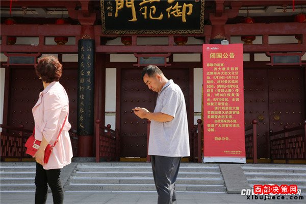 9月11日,西安大唐芙蓉園御苑門外,雙龍戲珠巨型花壇顯得格外喜慶。緊閉的大門口貼著閉園公告,因9月15日晚央視在大唐芙蓉園內(nèi)舉辦中秋晚會(huì),9月10日至9月18日期間,大唐芙蓉園臨時(shí)封閉。