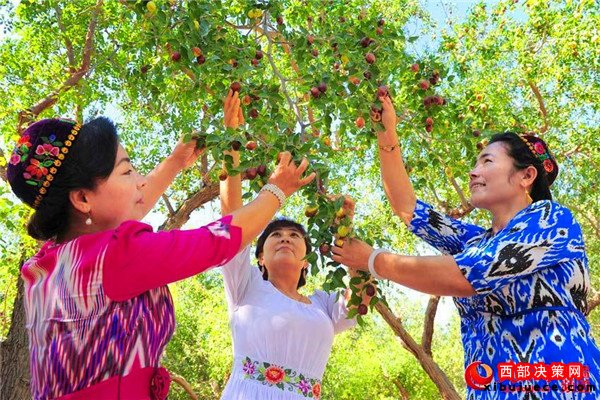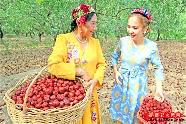 五堡鎮(zhèn)拉甫喬克村的棗農(nóng)熱孜瓦古麗·卡德?tīng)枺ㄗ螅┖颓皝?lái)幫忙的鄰居交談。