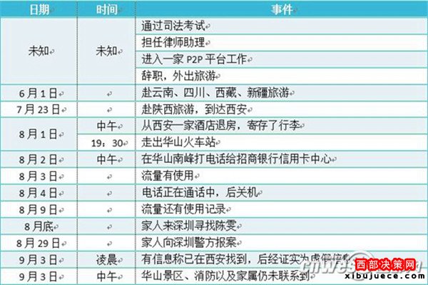 據(jù)陳雯表姐蔡女士介紹,陳雯于2016年6月1日起,自深圳前往云南、西藏、新疆等地游玩,7月22日自烏魯木齊飛往咸陽,隨后與家人失去聯(lián)絡(luò),且微信好友均被拉黑,自8月2日起,手機(jī)便處于關(guān)機(jī)狀態(tài)。