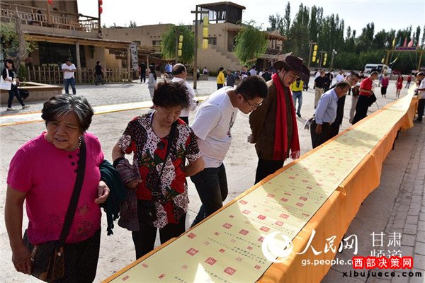 19日上午,在首屆絲綢之路(敦煌)國際文化博覽會召開之際,由敦煌正覺寫經(jīng)院打造的篆刻《道德經(jīng)》百米長卷在敦煌月牙泉小鎮(zhèn)亮相,“獻(xiàn)禮”文博會。