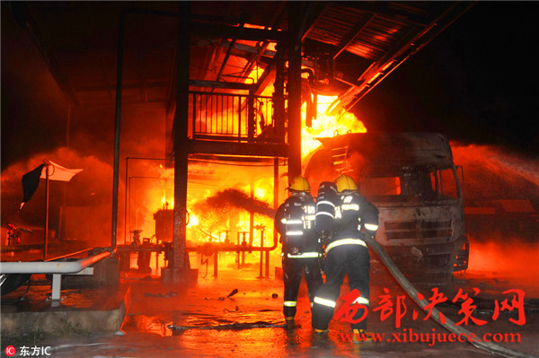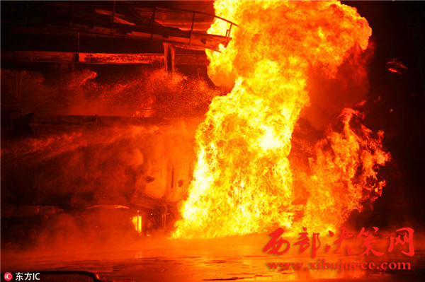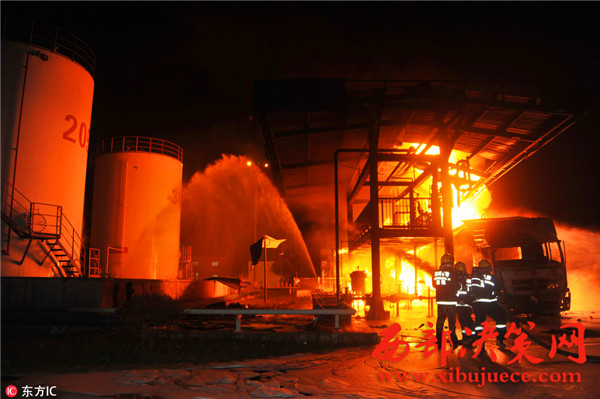 據(jù)了解,事故發(fā)生油罐區(qū)占地約40畝,主要生產(chǎn)航空汽油,油罐區(qū)共有油罐10個(gè),油罐內(nèi)裝有原料及航空汽油約300余噸,發(fā)油平臺(tái)往罐車內(nèi)輸送航空汽油時(shí)突然發(fā)生火災(zāi),燒毀發(fā)油平臺(tái)及油罐車等,著火油罐車儲(chǔ)量30噸,著火時(shí)車內(nèi)汽油約10噸,過(guò)濾器中有油約7噸,共計(jì)約17噸燃油,離鄰近儲(chǔ)油罐約30米。