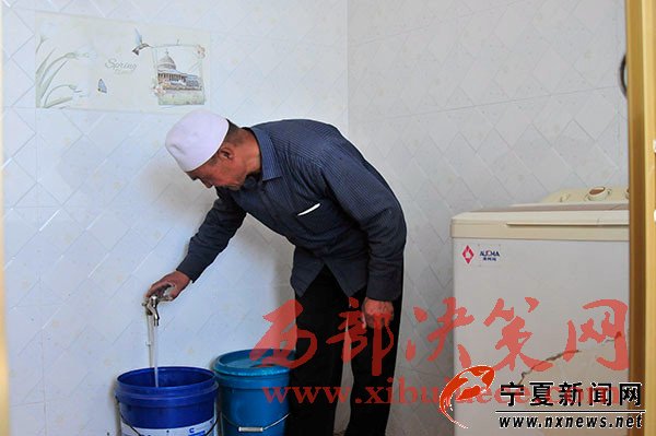 在海原水務(wù)局曹洼水利工作站站長牛志遠的帶領(lǐng)下,我們來到了白崖村村民馬正海的家。這是個干凈整潔的院落,兩間并排的磚瓦房,步入屋內(nèi),馬正海正在教老伴如何使用洗衣機。“50多歲了第一次用洗衣機,還不會操作呢” ,馬正海的老伴笑著說,“今年4月家里通上自來水,前陣子就去買了臺洗衣機,這在之前想都不敢想。”