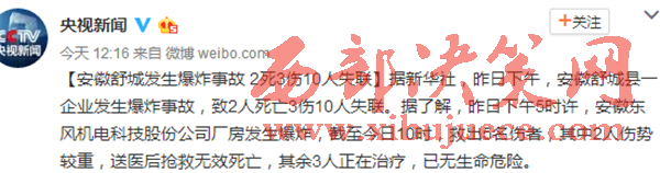 新聞中心官方微博今日消息稱,據(jù)新華社,昨日下午,安徽舒城縣一企業(yè)發(fā)生爆炸事故,致2人死亡3傷10人失聯(lián)。據(jù)了解,昨日下午5時(shí)許,安徽東風(fēng)機(jī)電科技股份公司廠房發(fā)生爆炸,截至今日10時(shí),救出5名傷者,其中2人傷勢(shì)較重,送醫(yī)后搶救無(wú)效死亡,其余3人正在治療,已無(wú)生命危險(xiǎn)。