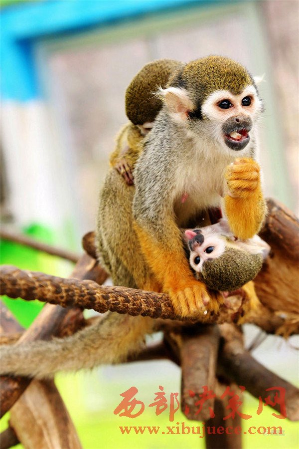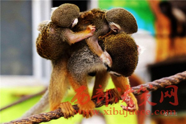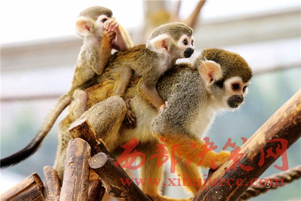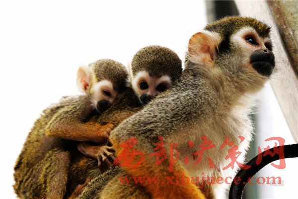 無論走到哪里松鼠猴都讓這個小家伙和自己的寶寶一起趴在自己背上玩耍、休息。