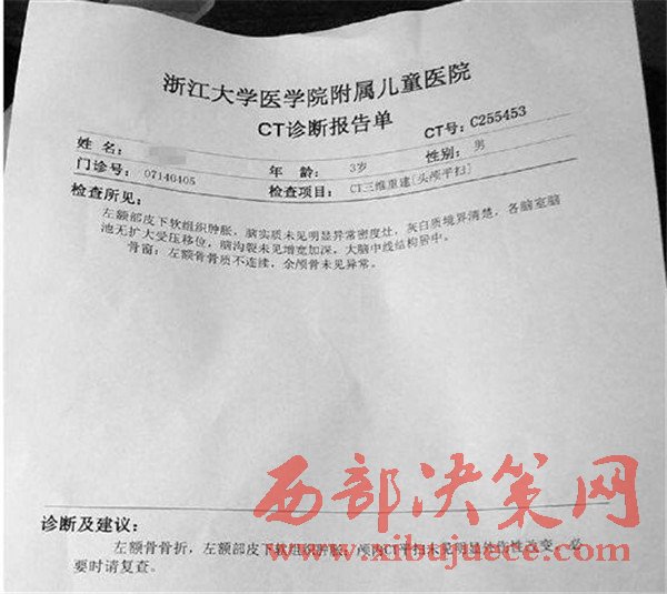 為了確認孩子的傷情,我和幼兒園的園長帶著孩子到了杭州的一家醫(yī)院進行檢查,檢查結(jié)果顯示孩子臉部骨折。