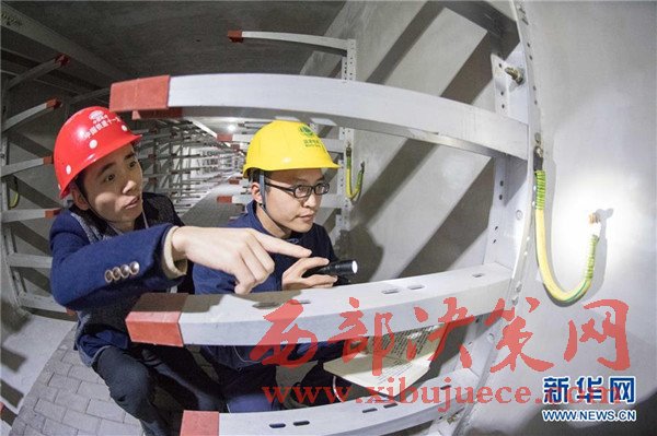 11月24日,解放碑地下環(huán)形電力隧道的一段支線電力隧道內(nèi),兩名國(guó)網(wǎng)重慶市區(qū)供電公司的技術(shù)人員(右一、右二)在對(duì)預(yù)留的商業(yè)用戶(hù)接入隧道的電力設(shè)施設(shè)備進(jìn)行竣工驗(yàn)收。當(dāng)日,經(jīng)過(guò)3年多的緊張建設(shè),重慶地下環(huán)形“電力高速路”——解放碑地下環(huán)形電力隧道工程順利通過(guò)竣工驗(yàn)收,并正式投入運(yùn)行。解放碑環(huán)形電力隧道總長(zhǎng)2408米,其中1198米的干線電力隧道已經(jīng)成功接入解放碑商圈及周邊地區(qū)的4個(gè)110千伏變電站形成環(huán)線,支線電力隧道1210米也開(kāi)始陸續(xù)接入用戶(hù)。據(jù)介紹,作為重慶市重點(diǎn)工程,2013年7月開(kāi)工建設(shè)的解放碑地下環(huán)形電力隧道按照滿(mǎn)足未來(lái)20年電力需求設(shè)計(jì),隧道高2.8米、寬2.4米,投入運(yùn)行后將解決重慶渝中半島和重慶最繁華的解放碑商業(yè)區(qū)配電設(shè)施老化、無(wú)法擴(kuò)建等問(wèn)題,使解放碑商圈供電負(fù)荷承載能力得到極大加強(qiáng)。