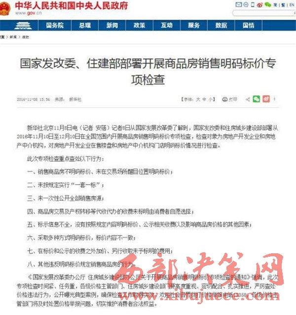 近日,國(guó)家發(fā)改委及住建部聯(lián)合發(fā)布了對(duì)商品房“明碼標(biāo)價(jià)”的新一輪整治措施。部署從2016年11月10日至12月10日在全國(guó)范圍內(nèi)開(kāi)展商品房銷(xiāo)售明碼標(biāo)價(jià)專項(xiàng)檢查。此次專項(xiàng)檢查重點(diǎn)查處以下八類(lèi)行為。“明碼標(biāo)價(jià)”、“一套一標(biāo)”、“醒目”、“自愿”、“一致”成為重點(diǎn)關(guān)鍵詞。