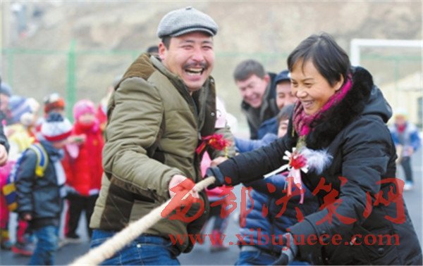 圖為11日,在大浦溝社區(qū)民族團結廣場,居民們正在進行拔河比賽。