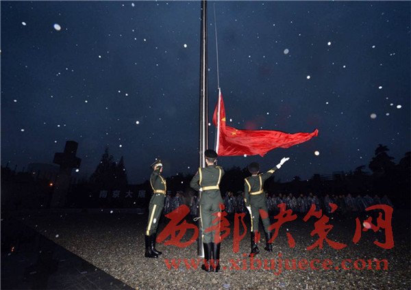 12月13日,江蘇省南京市,清晨7時(shí),五星紅旗從國旗桿頂部開始緩緩下降,降至半旗位置固定。