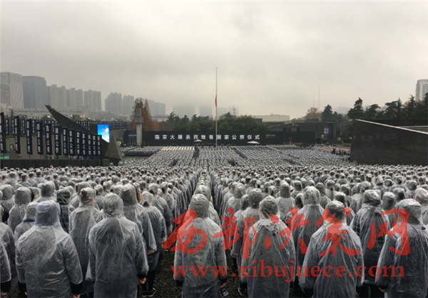 12月13日,十時(shí)整,雨中,南京大屠殺死難者國家公祭儀式在南京大屠殺遇難同胞紀(jì)念館隆重舉行。8000人冒雨參加了公祭,向30萬遇難同胞致哀,場(chǎng)面莊嚴(yán)肅穆。國家公祭儀式從上午10點(diǎn)正式開始,南京全城鳴笛致哀。