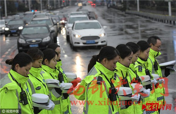 在南京市中心新街口,十點(diǎn)整,隨著凌厲尖銳的防空警報(bào)在南京上空拉響,往日熙攘熱鬧的新街口變得靜止。車輛緩緩?fù)W?,主?dòng)鳴笛致哀1分鐘。行色匆匆的路人也停下腳步在寒風(fēng)中低頭默哀。此刻,所有人共同緬懷在南京大屠殺中死難的同胞。
