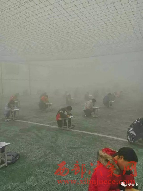 林州市教育體育局在12月19日上午就向全市各級各類學校下發(fā)通知,各中小學、幼兒園從12月19日中午12:00起開始停課,待紅色預(yù)警解除后恢復(fù)上課。既然空氣已經(jīng)處于嚴重污染狀態(tài),教體局已下發(fā)停課通知,臨淇鎮(zhèn)一中為何還要組織學生在露天的操場上進行考試?該校馮校長告訴記者,他們學校當天并沒有組織學生在外面考試,但是12月19日上午,他們確實組織學生在外面考試了,當時這里的霧霾沒有那么嚴重。