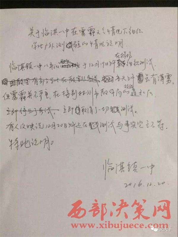 馮校長出示了一份手寫的情況說明:臨淇鎮(zhèn)一中八年級于12月19日上午在操場組織測試,當天上午雖有薄霧,但霧霾并不嚴重,在接到林州市教體局的通知后立即取消了一切測試。有人反映說12月20日上午還在測試,與事實完全不符。特此說明。“為什么有學生說19日下午也考試了?”記者追問,并說出了考試的科目。馮校長尷尬地笑笑:“組織都組織了,就考完吧。”據(jù)馮校長介紹,當時并沒有這么多學生在操場考試,有一部分學生在教室考的,在操場上考試的只有480多名學生。到底是什么樣的考試如此急迫,讓學生頂著霧霾也要進行?馮校長說,學生課講完了,這次考試是一個摸底測驗考試,也沒有那么急迫。
