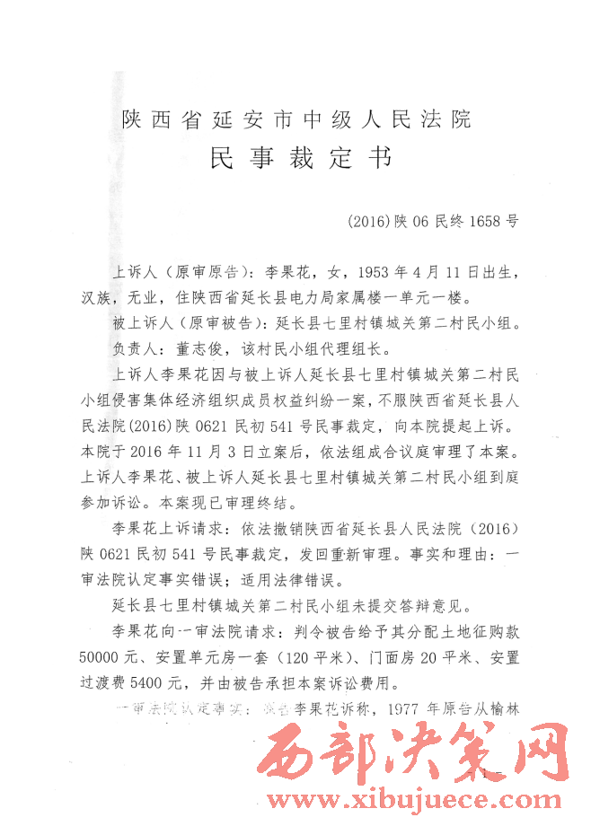 附:延安市中級人民法院民事裁定書和七里村鎮(zhèn)和城關(guān)二村李果花的協(xié)議書。