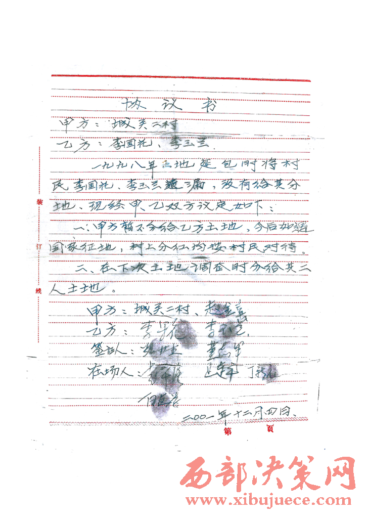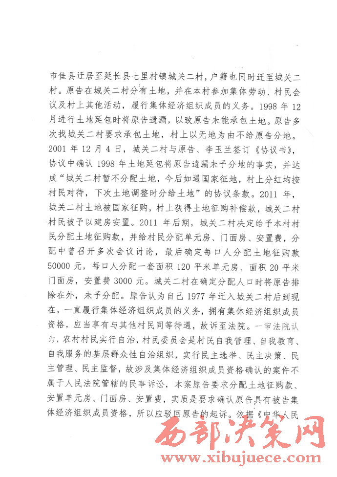 西部決策網(wǎng)訊(記者 封營庫 實(shí)習(xí)記者 李延梅)陜西延長縣七里村村民李果花反映稱:“1977年我從榆林市佳縣遷居至延長縣七里村鎮(zhèn)城關(guān)二村,戶籍也同時(shí)遷至城關(guān)二村。我在城關(guān)二村分有土地,并在本村參加集體勞動村民會議及村上其它活動,履行集體經(jīng)濟(jì)組織成員的義務(wù)。1998年12月進(jìn)行土地延包時(shí)將我遺漏,以致我未能承包土地。我多次找城關(guān)二村要求承包土地,村上以無地為由不給我分地。2001年12月4日,城關(guān)二村與我、李玉蘭簽訂《協(xié)議書》,協(xié)議中確認(rèn)1998年土地延包時(shí)將我遺漏未有分地的事實(shí),并達(dá)成“城關(guān)二村暫不分配土地,今后如遇國家征地,村上分紅均按村民對待,下次土地調(diào)整時(shí)分給土地”的協(xié)議條款。2011年,城關(guān)二村土地被國家征購,村上獲得土地征購補(bǔ)償款,城關(guān)二村村民被予以建安置房。2011年后期,城關(guān)二村決定給予本村村民分配土地征購款,并給村民分配單元房、門面房、安置費(fèi),分配中曾召開多次會議討論,最后確定每口人分配土地征購款50000元,每口人分配一套面積120平米單元房,面積20平米的門面房,安置費(fèi)5000元,城關(guān)二村在確定人口時(shí)將我排除在外,未予分配。我認(rèn)為自己1977年遷入城關(guān)二村后到現(xiàn)在,一直履行集體經(jīng)濟(jì)組織成員的義務(wù),擁有集體經(jīng)濟(jì)組織成員資格,應(yīng)當(dāng)享有與其他村民同等待遇,故訴至延長縣人民法院要求判令城關(guān)二村給予我分配土地征購款50000元,安置單元房一套(120平米)、門面房20平米,安置過渡費(fèi)5400元。但被延長縣人民法院以涉及集體經(jīng)濟(jì)組織成員資格的案件不屬于人民法院管轄的民事訴訟,駁回起訴。我又上訴至延安市中級人民法院,但又用同樣的理由又被駁回上訴。我該怎么辦?真的天下烏鴉一般黑嗎?我訴訟的是要回屬于我的征地款、安置房、過渡費(fèi),我有合法的戶口簿、身份證。又有延長縣城關(guān)鎮(zhèn)政府副鎮(zhèn)長張世杰、包村片長趙華強(qiáng)、包村干部白醫(yī)學(xué)、城關(guān)村村主任(二村村民)董志軍、二村村長趙金星,原二村會計(jì)王連平,原二村代表老村長丁興元,在鎮(zhèn)政府會議室簽訂的協(xié)議書。難道我的村民資格還要確認(rèn)嗎?我村村長董志軍的兒子董飛戶口也不在我村,又是公務(wù)員,現(xiàn)任延長縣紀(jì)律檢查委員會案件審理室主任,還有村長董志軍他父親。董長春早已去世,但也同樣分的征地補(bǔ)償款,安置單元房,安置過渡費(fèi)。望你們新聞媒體深入調(diào)查,將事實(shí)公布于眾,為我申冤,維護(hù)我的合法權(quán)益。”