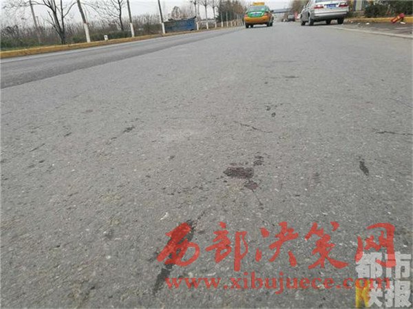 隨后,記者趕到現(xiàn)場。雖然現(xiàn)場已被處理,但是在路面上還是可以看到事故留下的斑斑血跡。