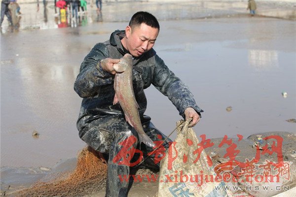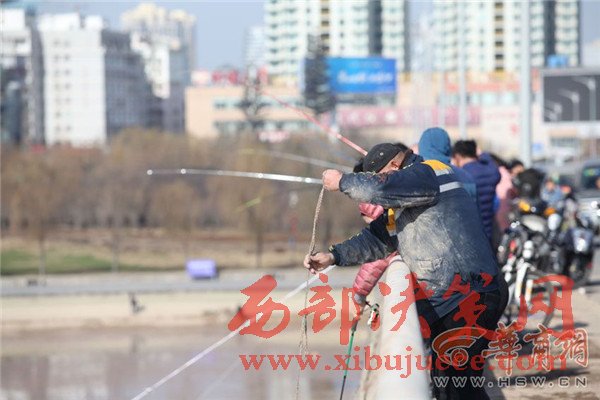 橋上釣魚人忙得不亦樂乎,橋下?lián)启~者也是爭先恐后。咸陽湖橡膠壩附近,不少市民拎著袋子和塑料桶在石縫里尋找殘留的小魚。比起這些撿小魚的市民,橡膠壩下面水洼處的幾名捕魚人則要更專業(yè)一些,他們下到水里,用力將網(wǎng)甩出去,一網(wǎng)子下去最少也有10多條大魚。有些人沒有撈到魚,便現(xiàn)場從捕魚人手里花上10元或20元,買上一條大魚心滿意足地回家去了。