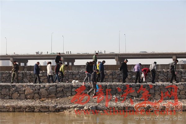 12月27日上午,咸陽湖放水剛結(jié)束,渭城橋下瞬間就變成了漁場,數(shù)百人在橡膠壩附近撿魚捕魚,有人甚至不顧危險(xiǎn)跑到淤泥里去撈魚。咸陽湖管理處工作人員提醒,湖底淤泥情況不明,市民切勿涉險(xiǎn)下湖撈魚,以免發(fā)生不測。