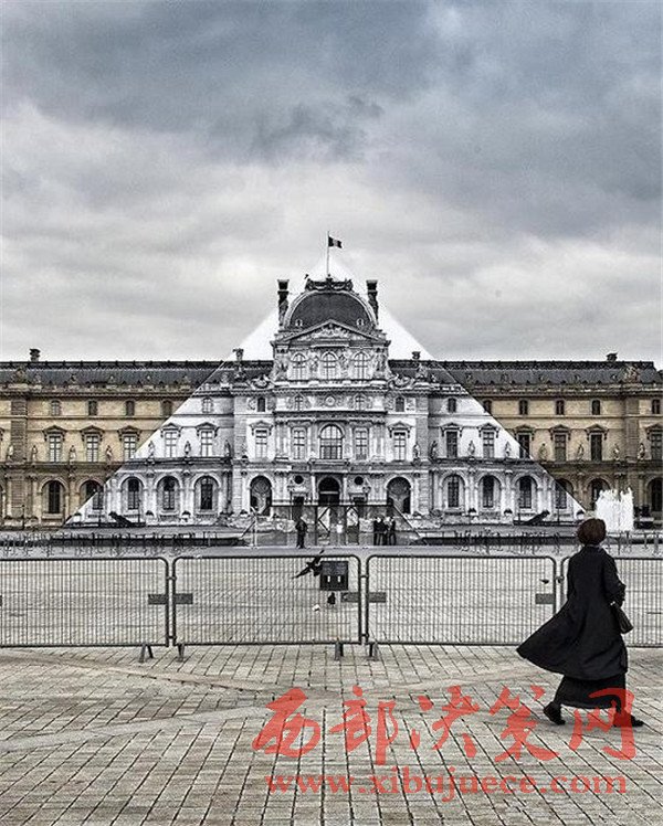 利用攝影技術(shù),法國(guó)街頭藝術(shù)家JR讓巴黎盧浮宮前著名的玻璃金字塔消失了。當(dāng)從一個(gè)精確的角度看過(guò)去,金字塔真的不見(jiàn)了,我們得以見(jiàn)到盧浮宮驚人的“真面目”。