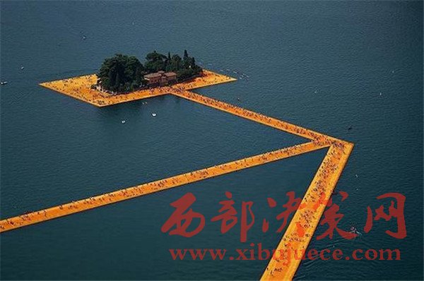 當(dāng)代概念藝術(shù)家Christo因開(kāi)拓土地藝術(shù)而聞名。在他最新的項(xiàng)目漂浮碼頭中,Christo搭建了很多亮黃色的小路,邀請(qǐng)意大利Sulzano的居民和游客步行通勤至別的導(dǎo)語(yǔ)。和Christo的其他裝置一樣,漂浮碼頭作品中的其他地方景觀也扮演著重要的角色。“湖周圍的山脈提供了鳥(niǎo)瞰該作品的地點(diǎn),展現(xiàn)了那些之前沒(méi)被注意的角度”,他解釋道。“水、風(fēng)、太陽(yáng),都是這個(gè)項(xiàng)目的一部分。”