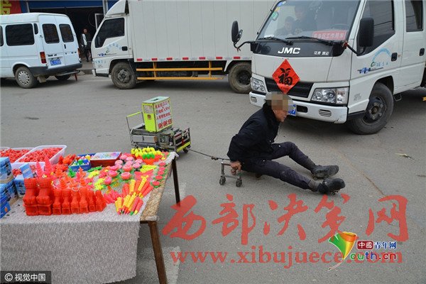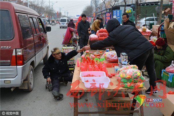 2017年2月6日,在山東省日照市莒縣南關(guān)大集上,今年58歲的葛平九,坐在他自己制作的小車上,用兩只手臂作支撐,拖著一雙殘腿,穿梭在車流和人流之間,向路邊賣蠟燭的攤位要求施舍。有愛心的攤主會(huì)給他一塊錢,有的會(huì)給他一根蠟燭。