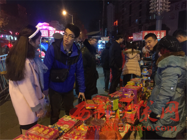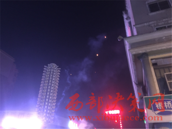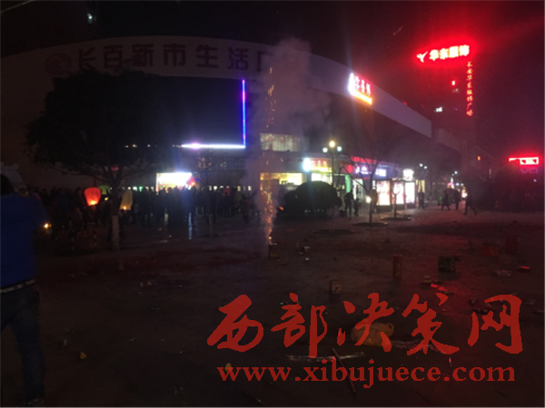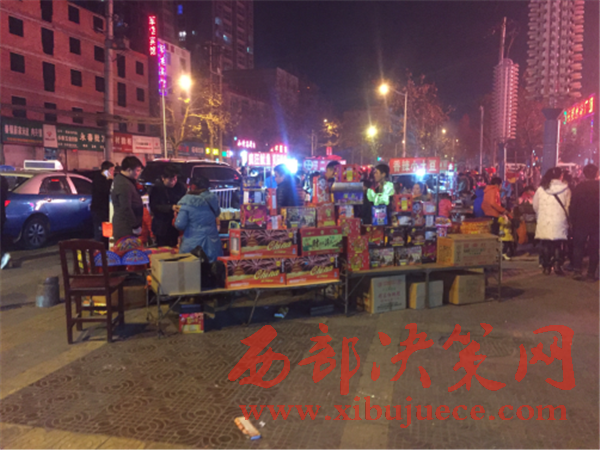 21時(shí),我社工作人員趕到了李女士所居住的長(zhǎng)安區(qū)步行街北口,見道路兩邊停滿了車輛,交通嚴(yán)重堵塞。廣場(chǎng)上鞭炮聲震耳欲聾,煙花四濺,空中濃煙滾滾,硝煙刺鼻。平均不到5分鐘就有一盞孔明燈迎空而上,現(xiàn)場(chǎng)圍滿了看熱鬧的市民。在現(xiàn)場(chǎng),一家賣煙花爆竹的攤位生意格外紅火,攤主在沒(méi)有任何防護(hù)措施的情況下就做起了買賣。
