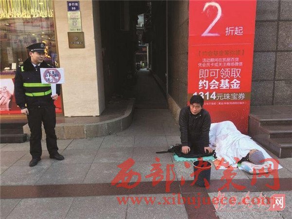 元宵節(jié)當(dāng)天,張家港沙洲路步行街一商場(chǎng)樓下,一名年輕男子以母親患重病為由跪地乞討,"母親"就躺在地上,旁邊站著一名城管協(xié)管員,舉起了寫著"詐騙請(qǐng)小心"的牌子。被攪了局的"行乞者"最后只能逃之夭夭。據(jù)當(dāng)事城管協(xié)管員介紹,乞討男子是個(gè)"熟面孔",當(dāng)天曾躲進(jìn)小弄堂里抽煙打電話,用的是蘋果手機(jī),抽的是中華煙,這讓他們更加確信,男子是職業(yè)行乞,根本不是家中有困難。揚(yáng)子晚報(bào)全媒體記者於蘇云