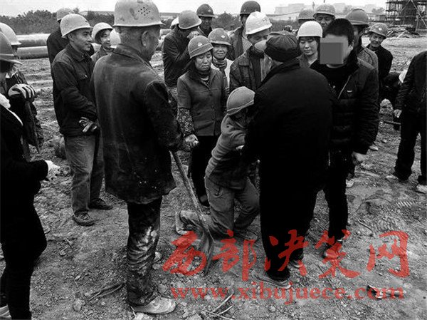 “大爺大媽,我給您跪下了,求求您們了,就讓我們干吧!”就在記者準備找工地負責(zé)人了解情況時,一男一女兩位農(nóng)民工突然撲通一聲跪倒在地,抓著其中一位老人的手哭著求情。“我們大伙都給您們跪下了,我們都是下苦人不容易……”看到有人跪地求情,其他農(nóng)民工也齊刷刷跪倒在阻擋者中的兩位老人面前,哭求開恩讓他們干活養(yǎng)家糊口。突如其來的變故,讓阻擋施工的5個人頓時慌了手腳。