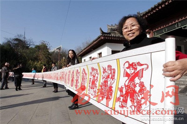 11月30日,在西安市蓮湖公園里,由民間剪紙藝人劉惠霞帶領6名殘疾人學員、3名志愿者,歷時一年多時間,創(chuàng)作的長22米、寬52厘米的《五十六個民族》巨幅剪紙作品。
