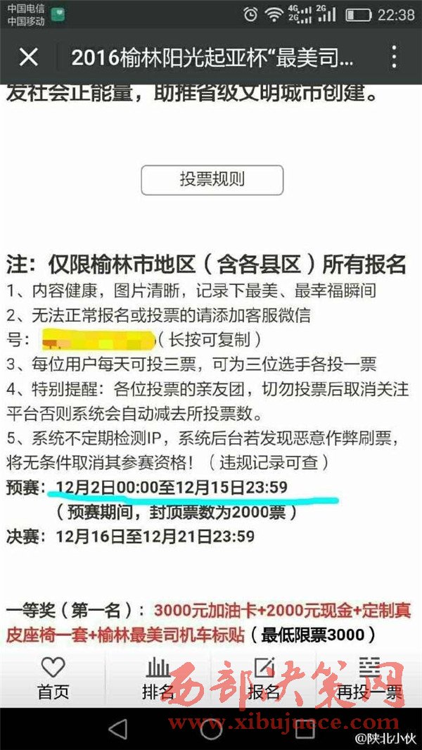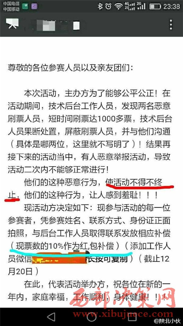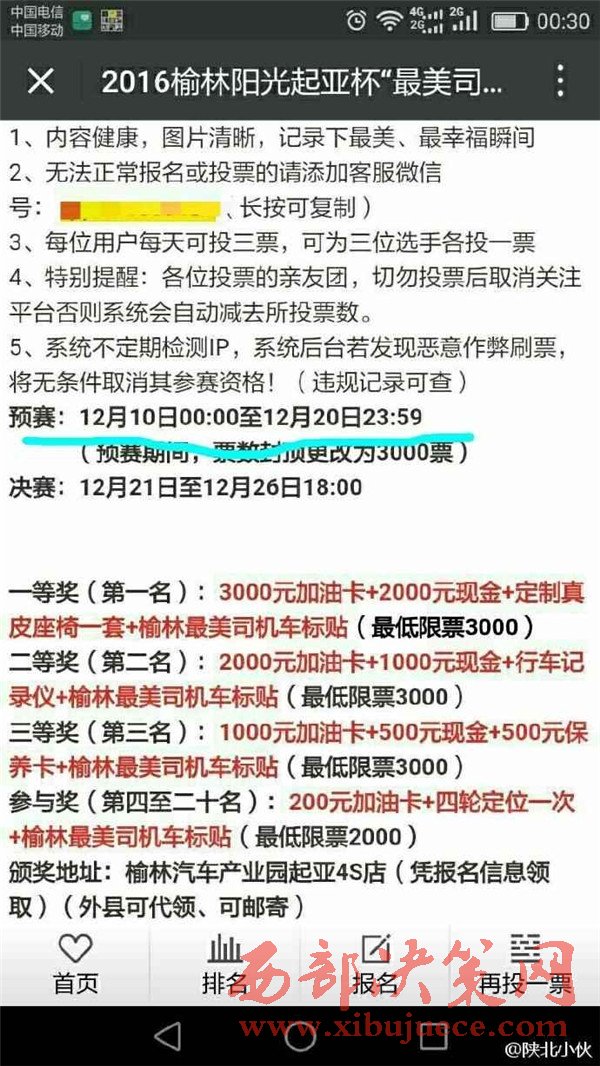 2016年12月初,榆林陽光汽貿(mào)通過某公眾號發(fā)起2016榆林陽光起亞杯“最美司機(jī)”評選活動,活動設(shè)置了豐厚了獎品作為獎勵。并組織全民參與評選活動的投票行為。至此,在榆林眾多市民的朋友圈都發(fā)起了轉(zhuǎn)發(fā)拉票行為。然而,此次拉票行為卻不斷變更投票時間和決賽時間。近日,某公眾號發(fā)布信息,聲稱陽光汽貿(mào)組織的“最美司機(jī)”活動取消,并給予相應(yīng)的票數(shù)補(bǔ)償。此行為卻引起眾多市民的質(zhì)疑,認(rèn)為陽光汽貿(mào)是在“消遣”參與投票的近萬名市民,從而變相成廣告推銷行為。究竟陽光汽貿(mào)是心疼評選活動的獎品發(fā)放,還是一種涉嫌商業(yè)的欺詐行為,請@榆林工商 ,根據(jù)《消費者權(quán)益保護(hù)法》予以重查重處。