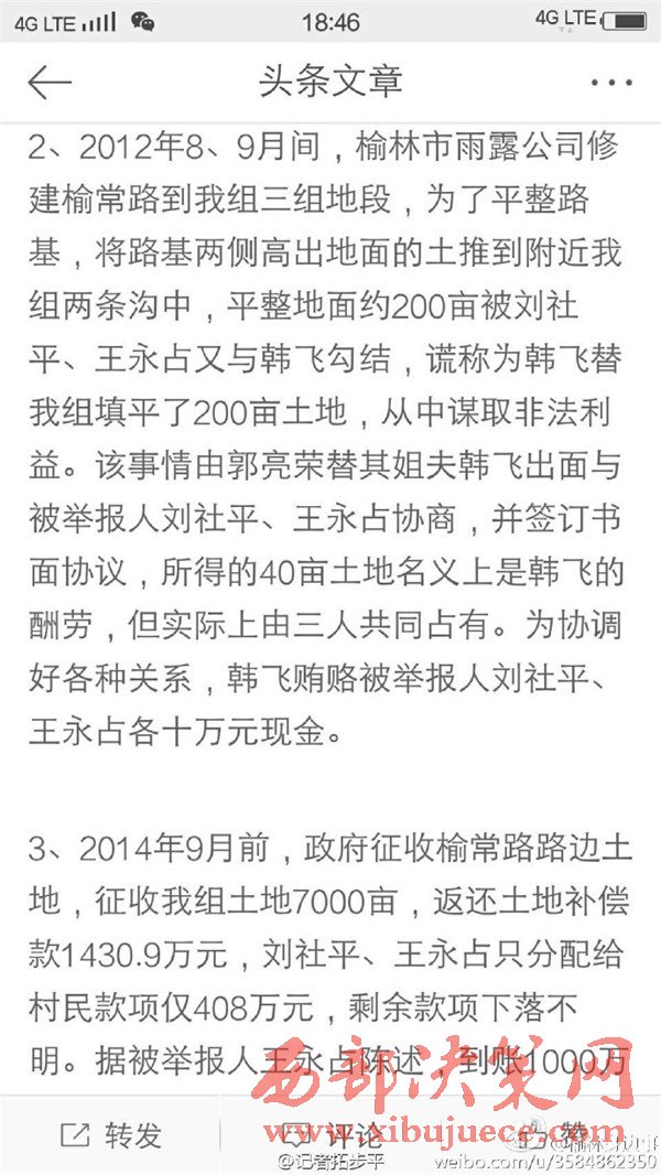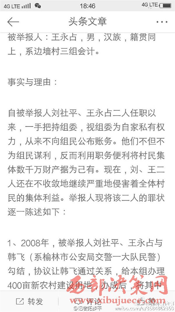 近日有微博網(wǎng)友飆新聞微博爆料:自被舉報(bào)人劉社平、王永占二人任職以來(lái),一手把持組委,視組委為自家私有權(quán)力,從來(lái)不向組民公布賬務(wù)。他們不但不為組民謀利,反而利用職務(wù)便利將村民集體數(shù)千萬(wàn)財(cái)產(chǎn)據(jù)為己有。請(qǐng)相關(guān)部門調(diào)查回復(fù)!