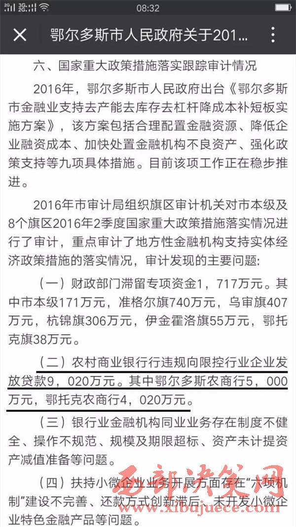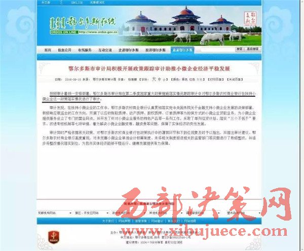 鄂爾多斯市人民政府網(wǎng)站刊登文章中稱:按照審計署統(tǒng)一安排部署,鄂爾多斯市審計局在第二季度國家重大政策措施落實(shí)情況跟蹤審計中對鄂爾多斯農(nóng)村商業(yè)銀行在扶持小微企業(yè)這一政策落實(shí)情況進(jìn)行了審計。