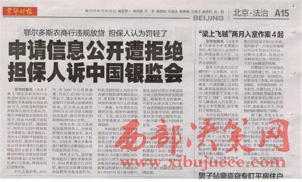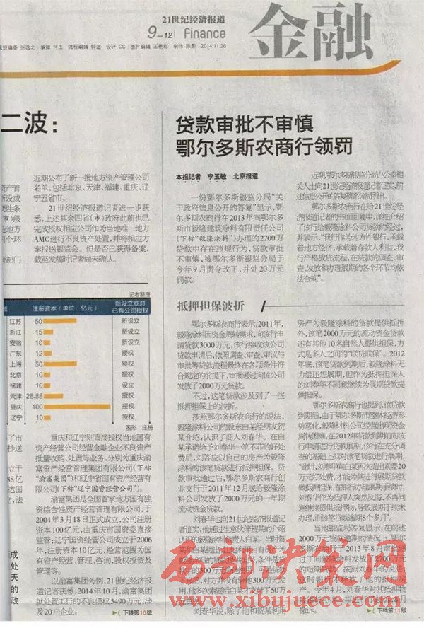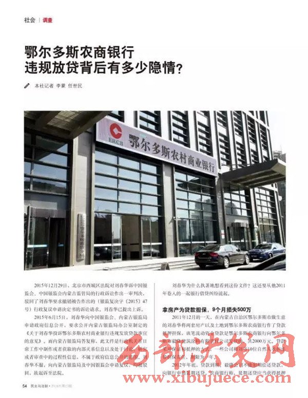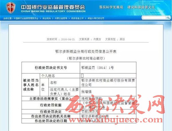 另查明:鄂爾多斯農(nóng)村商業(yè)銀行法人張?jiān)鰪?qiáng),又是內(nèi)蒙古信用聯(lián)合社理事會理事,共產(chǎn)黨黨員,管理不善,多次因非法經(jīng)營舉報,其中2012年2月29日,因違規(guī)簽發(fā)承兌匯票被內(nèi)蒙古銀監(jiān)局罰款50萬。