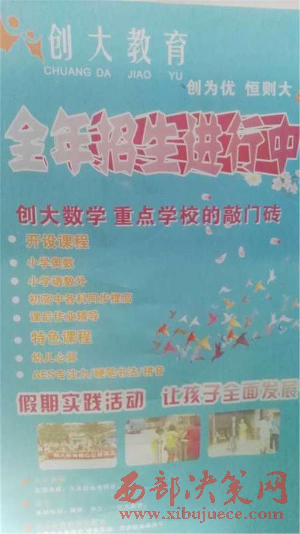 家長為了讓孩子能全面發(fā)展,常年穿梭于各類興趣、輔導(dǎo)班而樂此不疲。有的家長為了讓孩子上個好學(xué)校,托熟人、找關(guān)系,掏天價送孩子上所謂的名優(yōu)輔導(dǎo)機構(gòu),而實際上實屬無奈,敢恨不敢言,這一現(xiàn)象不得不讓人深思……!實際情況到底怎樣?本社工作人員根據(jù)群眾反映近期對一家名為“創(chuàng)大教育”的輔導(dǎo)班進(jìn)行實地了解,結(jié)果讓人大跌眼鏡。