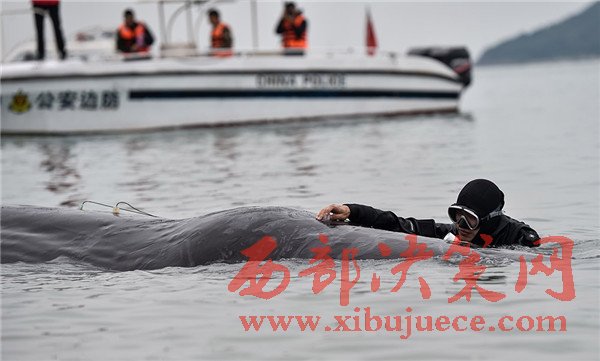 3月14日,在惠州港油庫(kù)碼頭附近海域,潛水員在抹香鯨身上安裝儀器對(duì)其進(jìn)行聽覺測(cè)試,判斷其健康狀況。