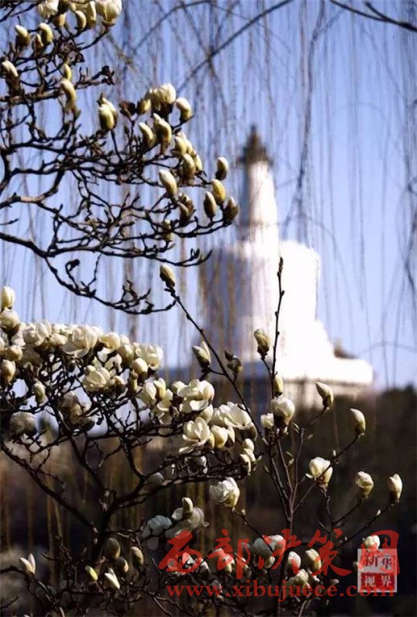 北海公園的白塔和盛開的玉蘭花