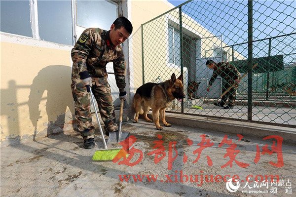 訓(xùn)導(dǎo)員王崇顏在清理犬舍,確保犬舍衛(wèi)生干凈整潔。