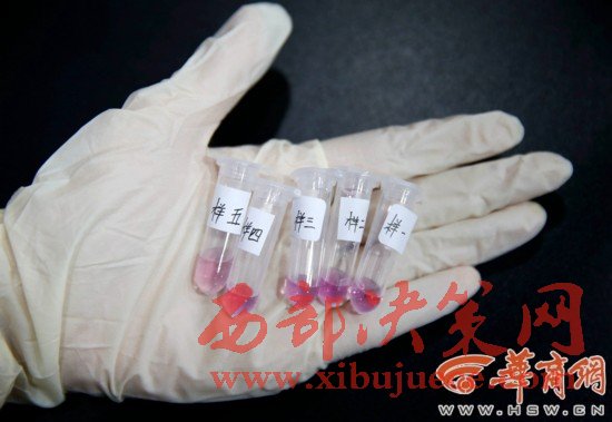 3.從1-5號浸泡液中取出200微升,滴在1.5ml的離心管里,滴加2滴硫酸鎂試劑1號(紫色),若顯色管中呈藍色,疑為摻硫酸鎂;