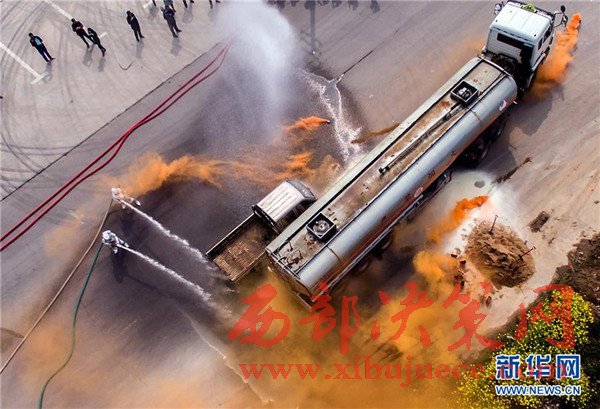 4月6日,參加演練人員對(duì)危化品運(yùn)輸車輛“交通事故”現(xiàn)場(chǎng)進(jìn)行處置。
