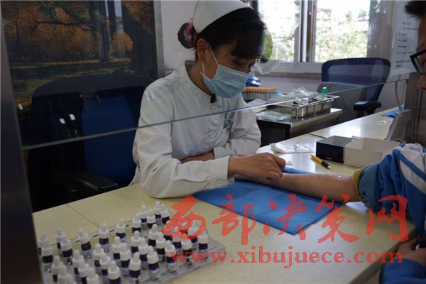 4月11日,北京大學(xué)世紀(jì)壇醫(yī)院變態(tài)反應(yīng)科化驗(yàn)室醫(yī)務(wù)人員在給患者做過敏源檢測(cè)。今年3月以來,這個(gè)科室就診人數(shù)從平時(shí)的日均100多人猛增到300多人。新華網(wǎng)韓家慧攝