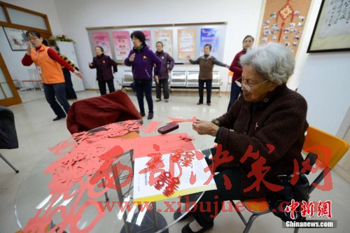 圖為93歲的薩可丁老人在社區(qū)居家養(yǎng)老站里剪紙。