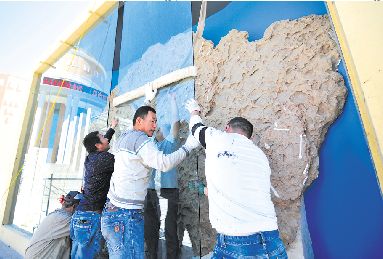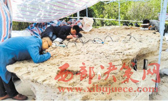 哈密科考隊隊員周紅嬌介紹,從2006年起,科考隊在哈密魔鬼城一帶搜尋早白堊紀(jì)翼龍以及其它恐龍化石,2016年10月,科考隊在魔鬼城發(fā)現(xiàn)了這個化石界的“大塊頭”。當(dāng)時我們是在一處坍塌的雅丹地貌上發(fā)現(xiàn)的,已被風(fēng)化得很嚴(yán)重,如不及時保護,很可能會受到更大損害。在與哈密博物館協(xié)商后,于當(dāng)年11月16日,將其運送到哈密博物館,今年4月份開始修復(fù)。”周紅嬌說,修復(fù)時,先使用機械設(shè)備清理化石周圍的圍巖,因為風(fēng)化比較嚴(yán)重,表層比較脆弱,因此修復(fù)時要十分小心,最后用氣吹和手捻手動清理。清理完畢后,會噴涂一層保護膠,用來保護化石。