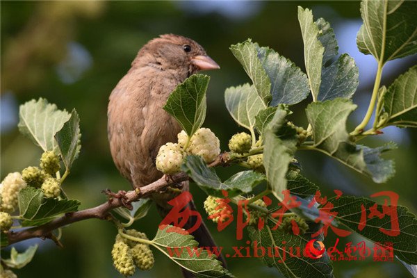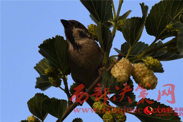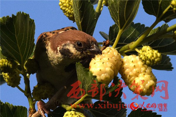 5月25日清晨,在新疆庫(kù)爾勒市一家住宅小區(qū),一只麻雀在吃桑葚。每年的5月底是新疆庫(kù)爾勒地區(qū)白、紅、黑三色桑葚熟透的季節(jié)。目前,三色桑葚已經(jīng)在新疆庫(kù)爾勒市大量上市,吸引市民爭(zhēng)相購(gòu)買品嘗。