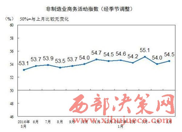 記者5月31日從中國(guó)物流與采購(gòu)聯(lián)合會(huì)獲悉,今年5月份中國(guó)非制造業(yè)商務(wù)活動(dòng)指數(shù)為54.5%,環(huán)比上升0.5個(gè)百分點(diǎn)。分析稱,這表明中國(guó)經(jīng)濟(jì)結(jié)構(gòu)優(yōu)化升級(jí)的動(dòng)力在進(jìn)一步增強(qiáng)。