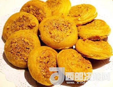 核桃饃為油面發(fā)酵而成。制作時需發(fā)酵三次,其間依次加入生面粉、食用植物油和用核桃仁經(jīng)過浸泡去皮后與椒鹽、芝麻等調(diào)味品一起制成的核桃泥,和勻,揪劑,搟成長條,表面再抹上核桃泥,做成圓餅,最后再加上核桃泥和植物油,進(jìn)爐烘烤。制成的核桃饃口感酥脆,味道香甜。