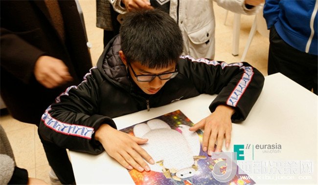 土豆和西紅柿根本就不是一個(gè)世界的,但它們走到了一起,變成了薯?xiàng)l和番茄醬它倆就是絕配;學(xué)籍制度和競(jìng)技運(yùn)動(dòng)也不是一個(gè)世界的,但它們?nèi)诤显诹艘黄穑兂闪祟^腦風(fēng)暴和趣味運(yùn)動(dòng)它們也可以很般配,現(xiàn)在就讓我們來(lái)看看它們是怎么融合的……聽(tīng)那陣陣氣球爆炸的聲音,他們開(kāi)始了!在這些綠油油的氣球中有事先設(shè)置的題目隊(duì)員們要先擠爆氣球答完題才能得到下一個(gè)地方的線索,“補(bǔ)考成績(jī)不合格以及成績(jī)低于50分必須怎樣?”“本科選修課學(xué)分不得低于多少學(xué)分?”這些題是不是還要開(kāi)動(dòng)腦袋瓜仔仔細(xì)細(xì)的想想才有答案呢?在比賽的現(xiàn)場(chǎng)一秒都會(huì)和對(duì)手拉開(kāi)差距,容不得一絲猶豫拿到線索的隊(duì)員們又奔向下一個(gè)地點(diǎn)熟悉的教室,這里也不是那么容易通過(guò),看著黑板上的題“冰怎么很快的化成水?”“可替代大學(xué)英語(yǔ)四級(jí)成績(jī)的考試有哪些?”哦,還有計(jì)算題,隊(duì)員們必須腦洞大開(kāi),腦細(xì)胞飛速運(yùn)轉(zhuǎn),做學(xué)霸那也是不容易的。只見(jiàn)黑板上粉筆一起一落,答題完畢,看看線索迅速趕往下一地點(diǎn)——地中海。這里指壓板、跳繩早已準(zhǔn)備好等著隊(duì)員們,學(xué)霸不能只管學(xué)習(xí)身體素質(zhì)也很重要,動(dòng)起來(lái)吧!在指壓板上跳繩,誰(shuí)想出來(lái)的?忍受著腳底的疼痛還要揮動(dòng)跳繩?太受虐,但是我們是一群不屈不撓的新一代,指壓板上跳繩我們也是鏗鏘有力、一絲不茍。終于結(jié)束痛并快樂(lè)著的跳繩環(huán)節(jié),卻看到了整整400塊的拼圖,這個(gè)環(huán)節(jié)真是讓人又愛(ài)又恨,還記得兒時(shí)玩拼圖的快樂(lè),但在這激烈的競(jìng)爭(zhēng)環(huán)境下,卻是讓人有點(diǎn)心慌和畏懼。隊(duì)員們最終齊心協(xié)力戰(zhàn)勝了它,細(xì)心、耐心的逐一完好的拼完了每一副圖。