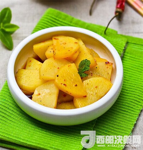 6.將調(diào)料澆入土豆片即可,其實這個菜還有一個做法,可以將調(diào)料中加上高湯和復(fù)合調(diào)料油,將土豆片浸泡,味道更加美,家庭操作通常以簡單易行為好。