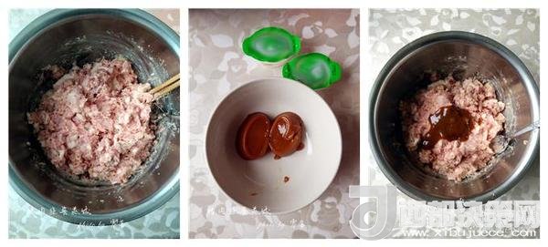 3、將變成漿糊的濃湯寶調入肉餡里;